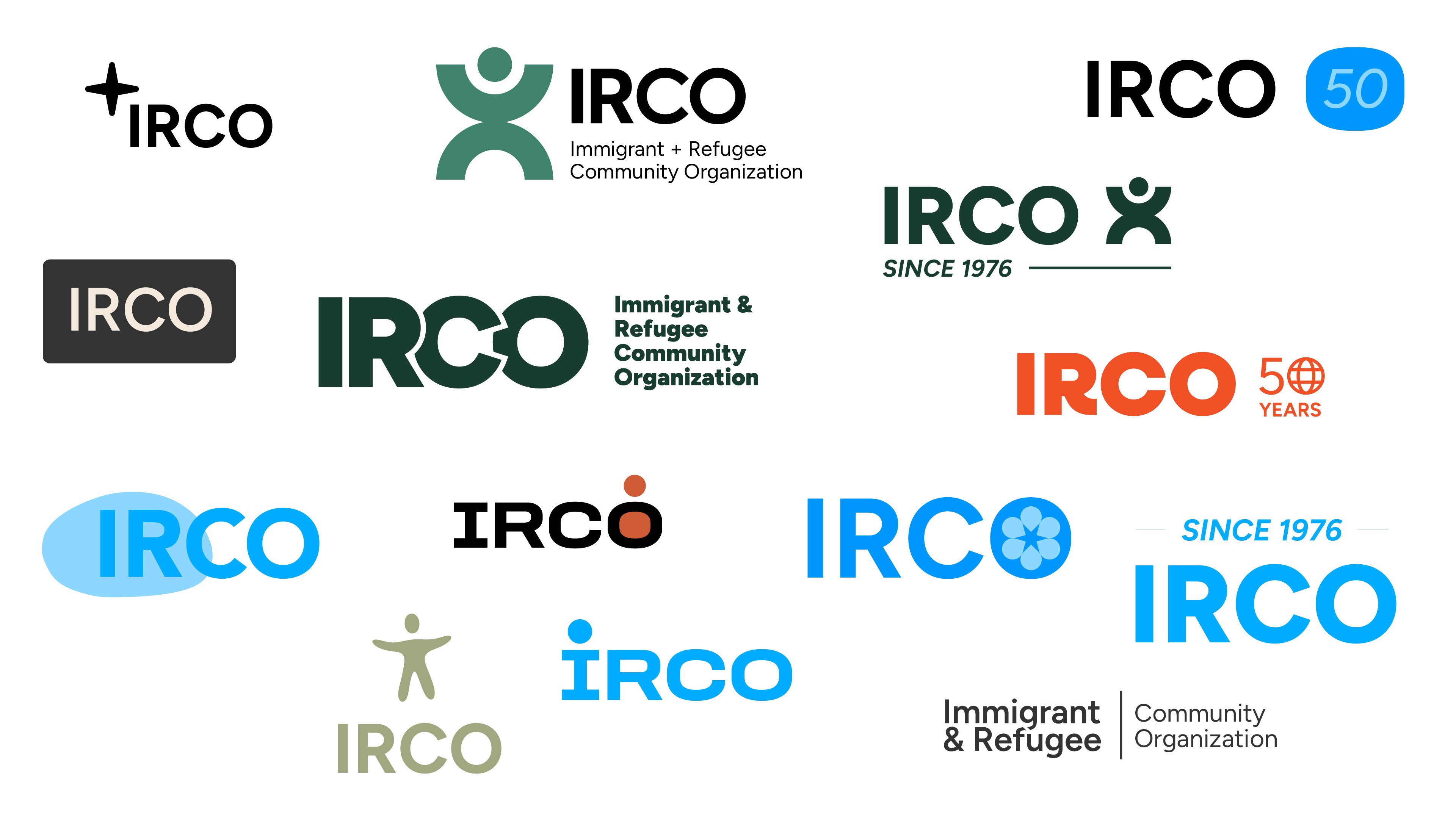 A part of this drafting process, I also created broader proposals for potential revisions to IRCO's primary logomark to coincide with the anniversary, although these didn't end up seeing use. Still, the exploration process was interesting, seeking to represent simply the broad cultural milieu of IRCO's staff and clients.